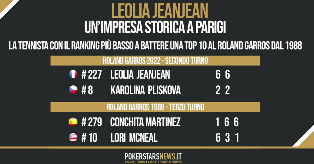 Jeanjean, numero 227 della classifica WTA, diventa così la tennista con ranking più basso a battere una Top 10 nello Slam parigino dall’ormai lontanissimo 1988.