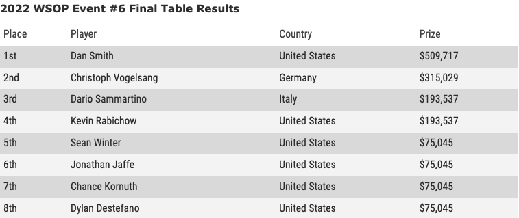 Il pro statunitense, che è al 7° posto della All Time Money List con 38,7 milioni di dollari, va invece a giocarsi la finale per il braccialetto contro il tedesco Vogelsang. E’ una partita sempre in bilico che dura quasi quattro ore. Con bui ormai altissimi e stack quasi pari (600k in più per Smith), i due finiscono ai resti preflop: Vogelsang con A♣10♣ e Dan Smith con A♥4♦. Quest’ultimo parte sotto, ma il flop gli sorride di nuovo: 4♠8♥2♦. Un 7♦ al turn e un 3♠ al river consegnano a Dan Smith il suo primo braccialetto WSOP e $509.717 di premio.