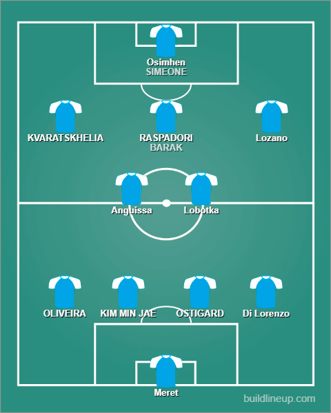 Il Napoli più probabile (4-2-3-1): Meret; OLIVERA, KIM MIN JAE, OSTIGARD, Di Lorenzo; Anguissa, Lobotka; KVARATSKHELIA, BARAK, Lozano; Osimhen.
