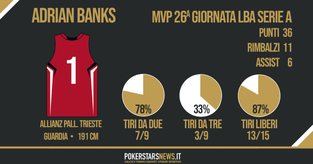 Ma anche i punti realizzati nel suo massimo di sempre in Serie A. La miglior versione della carriera italiana di Banks ha permesso a Trieste di spezzare una lunga striscia di 7 sconfitte consecutive, letale per quella splendida terza posizione in classifica con cui la squadra di coach Franco Ciani ha chiuso il girone d’andata. Ora, precipitata all’esterno della zona playoff, ha assoluta necessità di ricompattarsi per tentare un colpo di coda in questa fase conclusiva della stagione.