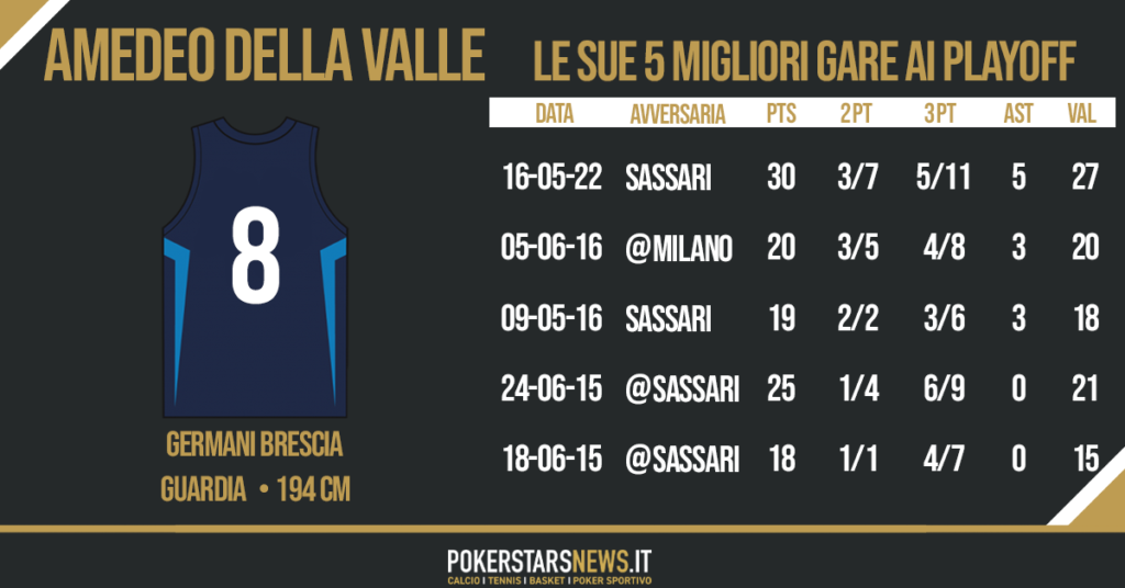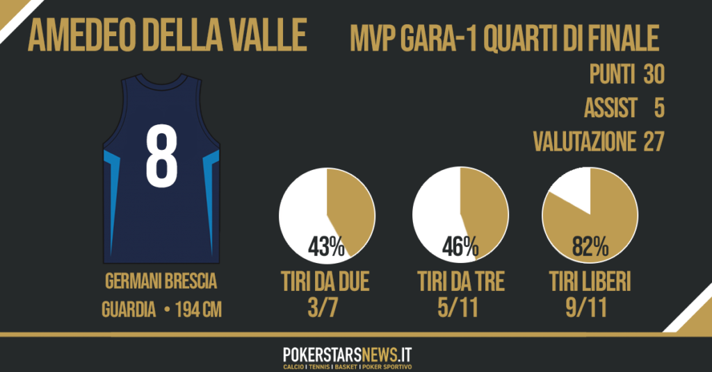 Dopo aver ricevuto il premio di miglior giocatore della regular-season per una stagione straordinaria con la casacca della Germani Brescia, Amedeo Della Valle non ha tradito le attese nel momento del bisogno. Anzi, se possibile, le ha alzate a un livello ancora più alto.