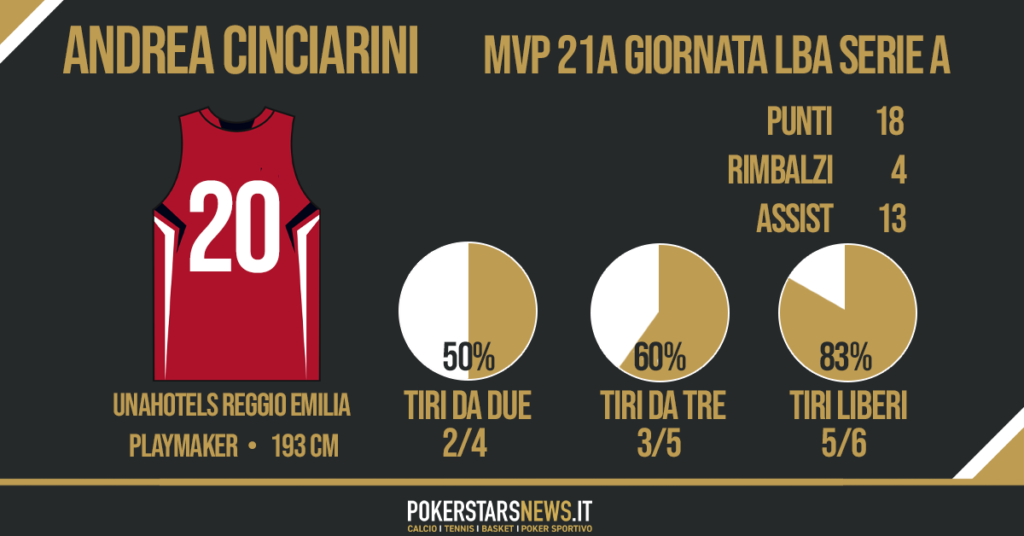Cinciarini ha gestito l’attacco in maniera oculata servendo ben 13 assist, suo massimo in carriera pareggiato, ma ha saputo mettersi in azione realizzando anche 18 punti, buoni per la sua seconda miglior prestazione offensiva stagionale e per la sua sesta doppia cifra consecutiva, l’ottava nelle ultime nove gare. Il 33 complessivo di valutazione è il dato più alto nell’intera giornata di Serie A.