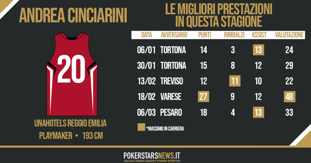 E domenica 6 marzo, alla ripresa del campionato, Cinciarini è stato ancora una volta il trascinatore nella vittoria casalinga della Reggiana sulla Carpegna Prosciutto Pesaro, un successo che ha permesso alla UnaHotels di riportare il proprio record in parità (10-10) e di risalire in sesta posizione in classifica, in piena corsa per un posto ai playoff. Il Cincia ha scritto una doppia doppia da 18 punti e 13 assist, pareggiando il suo massimo in carriera in quest’ultima categoria statistica.