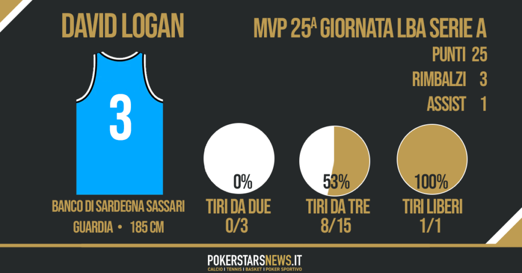 I 25 punti con 8/15 dall’arco realizzati nella vittoria di Sassari su Milano eleggono David Logan a MVP della 25a giornata. A 39 anni, è ancora un califfo per la nostra Serie A.