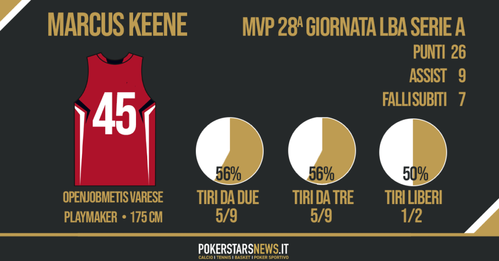 Ma, oltre alla bella vittoria per 103-92, c’è di più. Perché, con questa sfuriata, Keene scalza Amedeo Della Valle dalla vetta della classifica dei migliori realizzatori del nostro campionato. La sua media, ora, dice 18.8 punti a partita. Due cifre decimali in più rispetto all’azzurro della Germani Brescia, grandissimo candidato per ricevere l’MVP dell’intera regular-season.