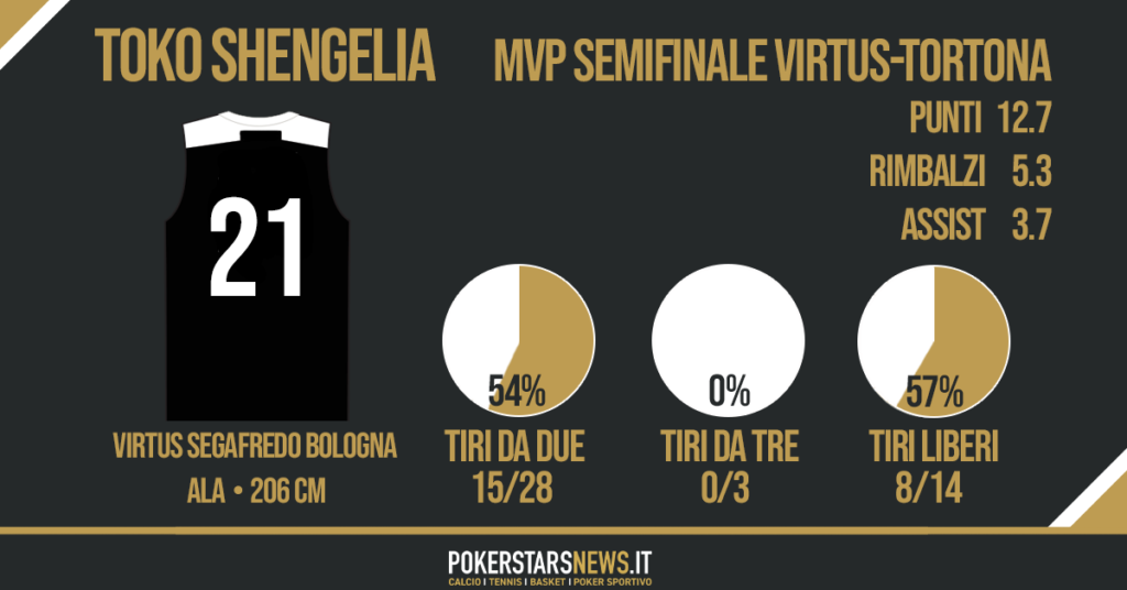 Shengelia ha sorretto il sistema della Virtus per buona parte dei primi tre periodi, trovando vantaggi con i suoi movimenti in post-basso. E il suo canestro del +13 alla metà del terzo quarto, una splendida schiacciata in contropiede, si è tramutato nel colpo di grazia per abbattere una Tortona già scricchiolante.