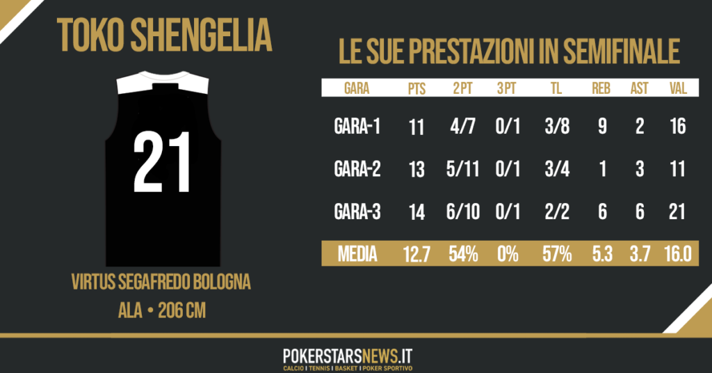I numeri di Shengelia sono migliorati di partita in partita. In gara-1, nonostante qualche problema in lunetta (3/8), ha fornito assieme a Mam Jaiteh una dimensione interna importante per l’attacco della Virtus, ispirato sul perimetro da Marco Belinelli. Inoltre, ha saputo farsi valere anche a rimbalzo con 9 catturati, suo massimo nella serie.