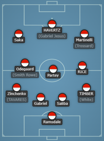 4-3-3: Ramsdale; TIMBER (White), Saliba, Gabriel, Zinchenko (TAVARES); Partey, RICE, Odegaard (Smith Rowe); Saka, HAVERTZ (Gabriel Jesus), Martinelli (Trossard). All. Arteta.