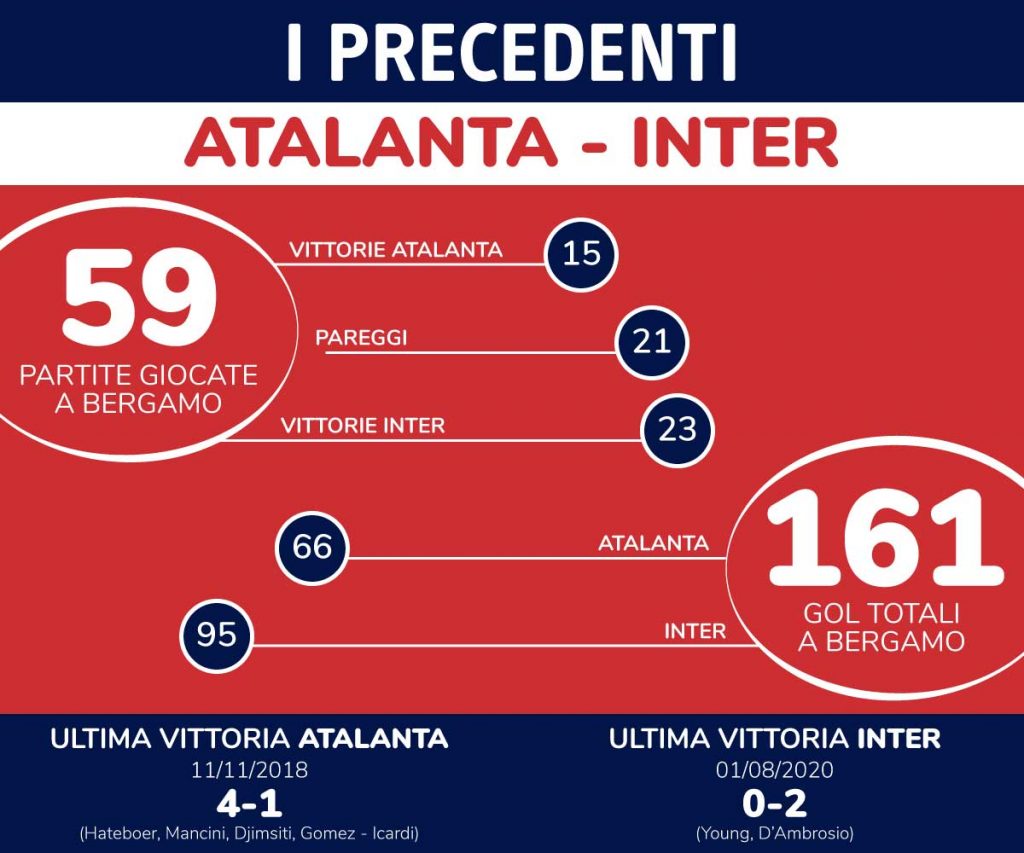 L’ultimo confronto a Bergamo risale al primo agosto 2020, nella cui occasione finì 0-2 per l’Inter con gol di D’Ambrosio e Young.