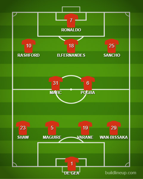 Manchester United(4-2-3-1): De Gea; Shaw, Maguire, Varane, Wan-Bissaka; Matic, Pogba; Rashford, Bruno Fernandes, Sancho; Ronaldo (Cavani).
