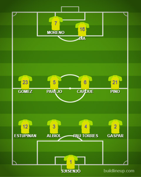 Villareal(4-4-2): Sergio Asenjo; Estupinan, Albiol, P.Torres, Gaspar; Moi Gomez, Capoue, Parejo, Yeremi Pino; G.Moreno, Dia.