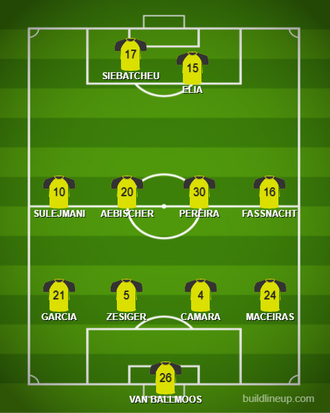 Young Boys Berna (4-4-2): Von Ballmoos; Garcia, Zesiger, Camara, Maceiras; Fassnacht, Aebischer, Pereira, Sulejmani; Siebatchen, Elia (Mambimbi).