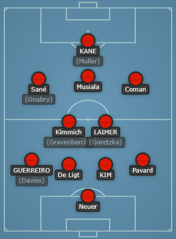 4-2-3-1: Neuer; Pavard, KIM MIN-JAE, De Ligt, GUERREIRO (Davies); Kimmich (Gravenberch), LAIMER (Goretzka); Sané (Gnabry), Musiala, Coman; Kane? (Muller). All. Tuchel.