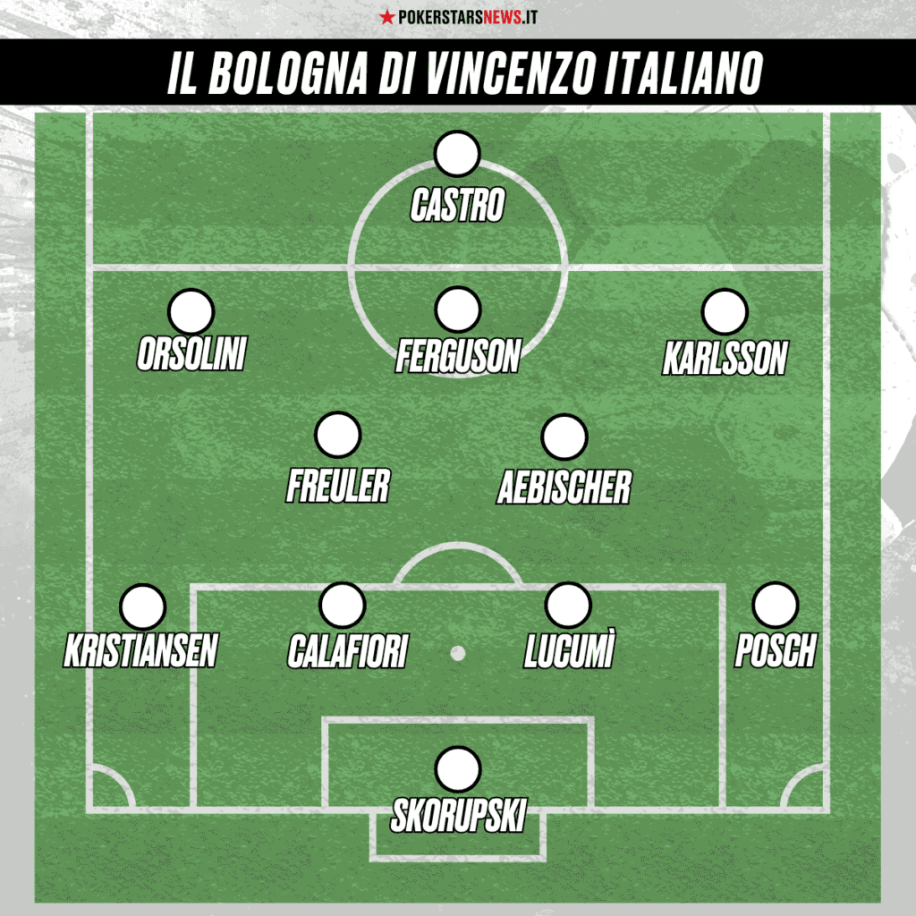- Bologna (4-2-3-1): Skorupski (Ravaglia); Kristiansen (Corazza), Lucumì (Soumaro), Calafiori (Beukema), Posch (De Silvestri); Freuler (Moro), Aebischer (El Azzouzi); Orsolini (Saelemaekers), Ferguson (Fabbian), Karlsson (Ndoye); Castro (Odgaard).