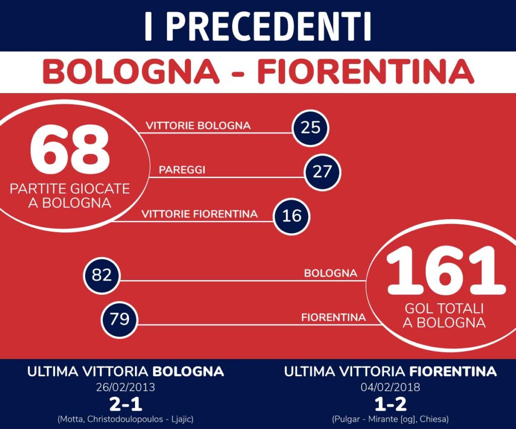 Dobbiamo tornare al 4 febbraio 2018 per l’ultima vittoria della Fiorentina che vede i viola passare in vantaggio grazie ad uno sfortunato autogol di Antonio Mirante, poi pareggiato da un gol di Erick Pulgar direttamente su calcio d’angolo. Decisivo per i tre punti fu il gol di Federico Chiesa che valse i tre punti. Per trovare un Bologna vincente contro i viola invece dobbiamo tornare al 26 febbraio 2013, quando i gigliati andarono in vantaggio con Adem Ljajic ma i felsinei prima pareggiarono con Marco Motta e quindi la ribaltarono con il gol di Lazaros Christodoulopoulos