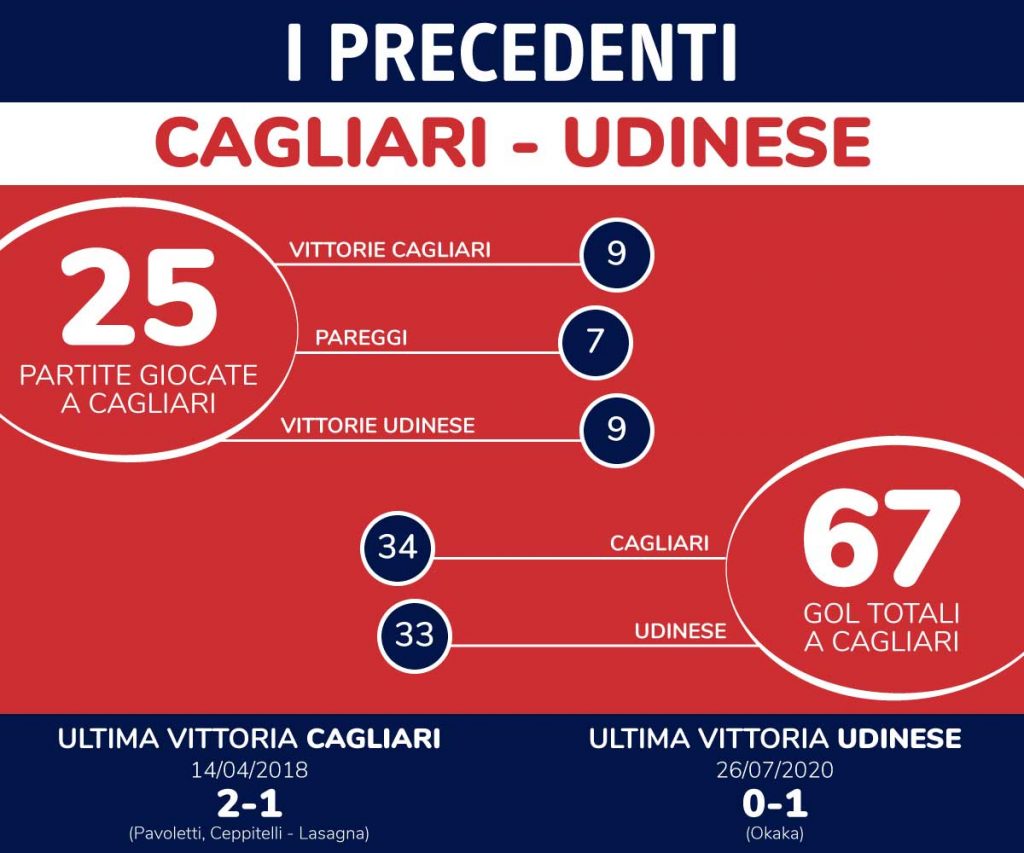 25 precedenti di serie A in terra sarda tra Cagliari e Udinese e bilancio di perfetta parità, con 9 vittorie dei sardi, 9 dei friulani e 7 pareggi. I padroni di casa hanno solo un leggerissimo vantaggio per quanto riguarda i gol segnati, 34 contro 33.