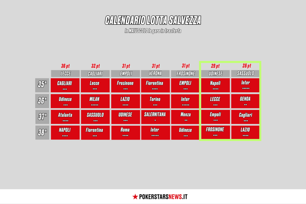 Ballardini sembrava aver portato a una maggiore stabilità gli emiliani, ma il Sassuolo si è sciolto e ora rischia per davvero. Nel prossimo turno incontrerà l’Inter e all’ultima giornata andrà in casa della Lazio all’Olimpico. Si mette molto male per i neroverdi. Un destino simile, incredibilmente, riguarda anche l’Udinese, vicina all’impresa domenica nel lunch-match contro il Bologna di Thiago Motta.