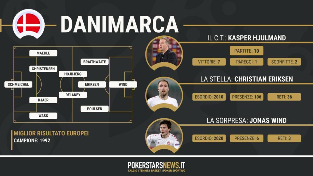 Il debutto ufficiale nell’Europeo 2021 da parte dei danesi è previsto il 12 giugno alle 18.00, nel derby scandinavo con la Finlandia a Copenhagen. La seconda gara è schedulata per il 17 giugno, sempre alle 18.00 e sempre a Copenhagen contro il Belgio. Infine, il 21 giugno alle 21.00 ancora in casa, contro la Russia.