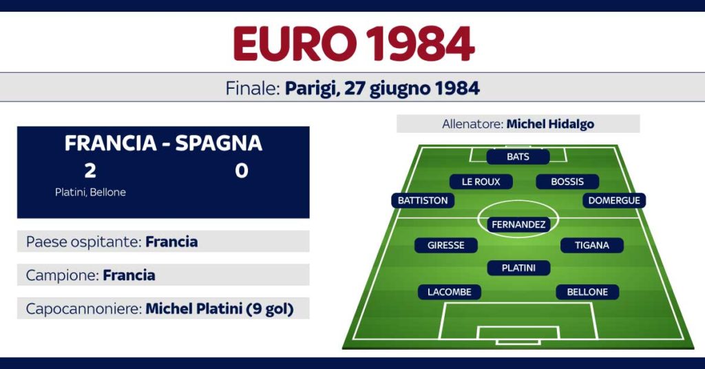 Al fischio finale il più commosso è però Platini. Lui che aveva tutta la pressione addosso, che doveva caricarsi la squadra sulle spalle, è riuscito a spezzare la maledizione francese per il calcio e a portare finalmente un titolo importante in bacheca. Lo ha fatto giocando un torneo pazzesco, siglando 9 reti totali, per un record imbattuto a tutt’oggi, quando di partite se ne giocano quasi il doppio per vincere il trofeo.