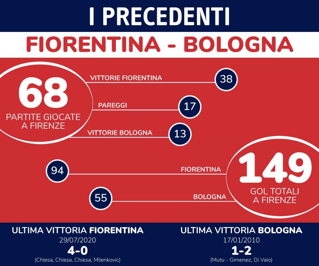 La vittoria dei felsinei sfugge dal 17 gennaio 2010, quando i gol di Henry Gimenez e Marco Di Vaio nel primo tempo garantirono i 3 punti al Bologna, nonostante il gol di Adrian Mutu nel finale per la Fiorentina (anche allora allenata da Cesare Prandelli). Da allora negli ultimi 10 anni solo 2 pareggi e ben 7 vittorie viola, l’ultima delle quali lo scorso 29 luglio, con un netto 4-0 che ha visto assoluto protagonista Federico Chiesa, autore di una tripletta, inframezzata solo dal gol di Nikola Milenkovic.