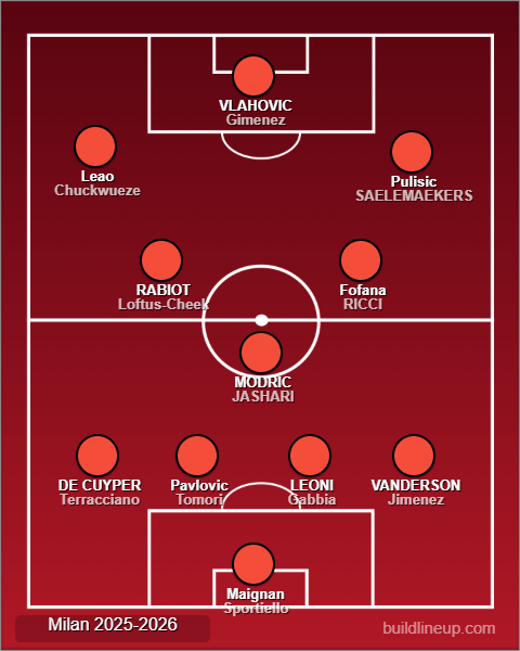 In avanti il tridente è potente: Vlahovic, se il colpo andrà in porto, sarà il centravanti tanto cercato, con Pulisic e Leao ai suoi fianchi, a garantire tecnica, estro e gol. Gimenez resta in orbita, ma più indietro nelle gerarchie. Saelemaekers, confermato da Allegri, sarà una preziosa risorsa di equilibrio, mentre Chukwueze rappresenta l’elemento di rottura, pronto a entrare e cambiare l’inerzia.