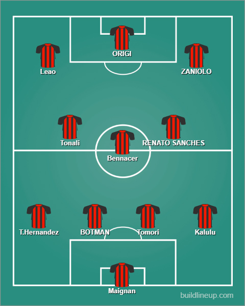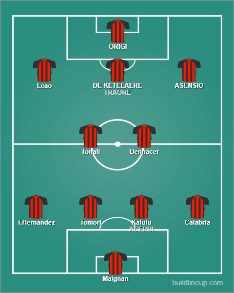Probabile Formazione Milan 2022-23 (4-2-3-1): Maignan; Calabria Kalulu (ACERBI), Tomori, Hernandez; Bennacer, Tonali; ASENSIO, DE KETELAERE (TRAORE), Leao; ORIGI All. Pioli.