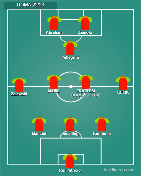 Roma 2023 (3-4-1-2): Rui Patricio; Kumbulla, Smalling, Mancini; CELIK, Cristante (MATIC), WIJNALDUM (DOUGLAS LUIZ), Zalewski; Pellegrini; DYBALA, Abraham(BELOTTI). – All. J. Mourinho