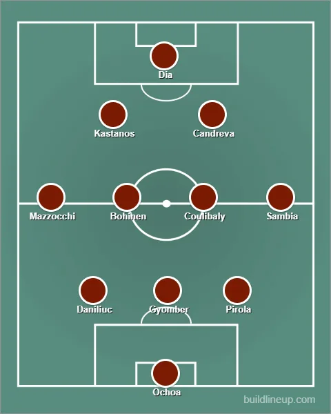 Nel 3-4-2-1, Kastanos e Candreva alle spalle di Dia, unico terminale offensivo. Sugli esterni agiranno Sambia a destra e Mazzocchi a sinistra, per una squadra che nelle ripartenze può davvero far male ai rivali.