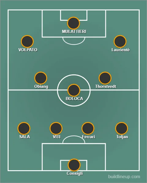 4-3-3: Consigli; Toljan (MISSORI), Ferrari (Erlic), VITI, Marchizza (SALA); Obiang, BOLOCA, Thorstvedt; VOLPATO, Pinamonti (MULATTIERI), Laurienté (Bajrami). All. Dionisi