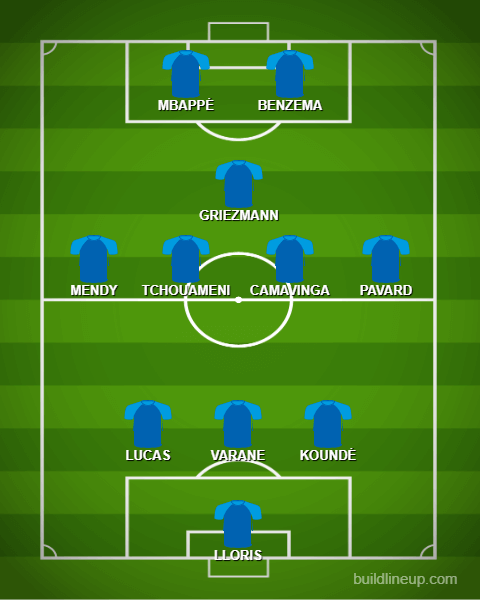 3-4-1-2: Lloris, Lucas, Varane, Koundé; Pavard, Camavinga, Tchouameni, Mendy; Griezmann; Benzema, Mbappé.