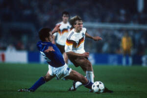 Luca Vialli e il CT Azeglio Vicini per noi, Andy Brehme e il CT Franz Beckenbauer per i tedeschi, che al tempo erano ancora tedeschi dell’Ovest. Quell’europeo fu infatti l’ultimo prima della caduta del muro di Berlino e il dissolvimento dell’Unione Sovietica, che ci avrebbe fatto salutare per sempre denominazioni come “URSS”, “DDR” e RFD”.