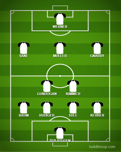 - (4-2-3-1): Ter Stegen; Kehrer, Sule, Rudiger, Raum; Kimmich, Gundogan; Gnabry, Muller, Sanè; Werner.