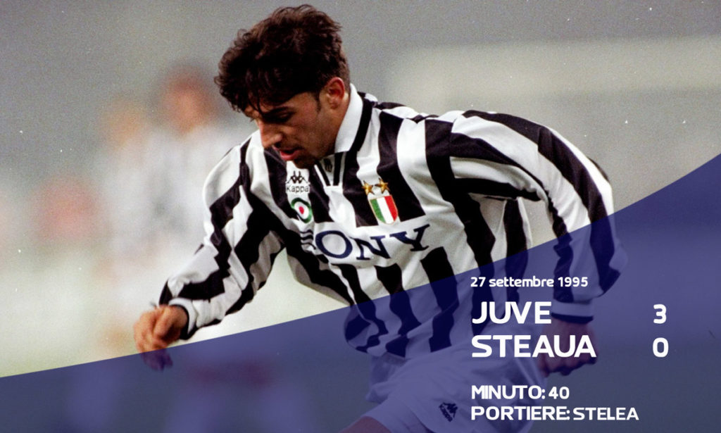 27 settembre 1995. La Juventus ospita i rumeni della Steaua Bucharest. Il punteggio finale è di 3-0. A due settimane esatte dal primo gol alla Del Piero, arriva un’altra perla assoluta, e la firma non può essere che quella di Pinturicchio. Siam fuori dall’area di rigore – caratteristica fondamentale per distinguere l’ortodosso gol alla Dal Piero da quello di altra confessione; Alex rientra sul destro, salta un avversario con la consueta finta a togliere la gamba – una sorta di calcetto all’indietro che colpisce l’aria; roba che a ripeterne l’esecuzione c’è il rischio di farsi male alla cartilagine del ginocchio; calcia con il collo interno del piede. Il portiere, che sembra aspettarsi quel tiro – infatti è molto vicino alla linea di porta – non può che toccare il pallone e vedersi scavalcare dallo stesso; incrocio dei pali toccato, rete gonfiata. Meraviglia delle meraviglie, ma non è finita qui.