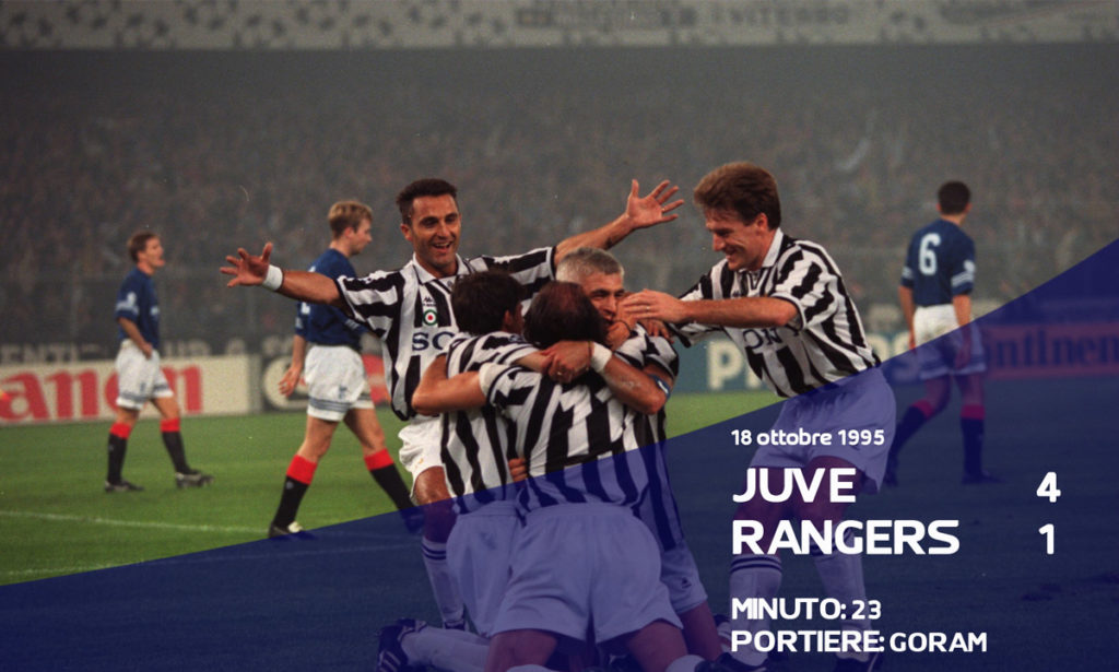 Arriviamo così alla conclusione del trittico che, senza se e senza ma, sancisce il gol alla Del Piero. Si gioca Juventus-Glasgow, 18 ottobre 1995. La partita finirà 4-1. In questo caso il gol è su punizione – quella che diventerà col tempo una delle specialità di Alex. Siamo ad almeno una ventina di metri dalla porta, appena fuori dall’area di rigore, spostati sul lato sinistro del campo; anche qui, ci si aspetterebbe un semplice cross in mezzo; il piede di Del Piero, dopo il tocco di Sousa – punizione a due –, riesce invece ad inventarsi – è giusto qui chiamare in causa il piede, più che Del Piero – una traiettoria che, alzandosi in cielo, cade dalle nubi fino all’incrocio dei pali dalla parte opposta a dove il pallone era stato colpito: un gol impensabile anche coi palloni odierni. Figurarsi all’epoca con quei palloni – più vicini al piombo che al cuoio.