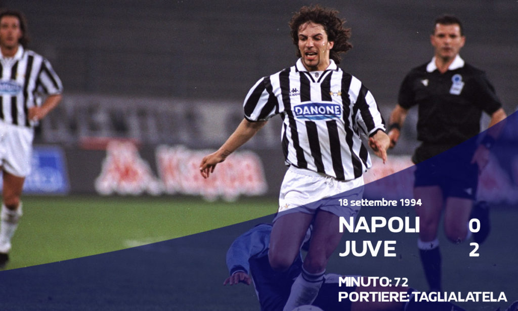 L’azione è apparentemente semplice. Antonio Conte sfrutta l’indecisione di due difensori partenopei per infilarsi nel varco da entrambi lasciato al limite dell’area di rigore. Sopraggiunge un fulmineo Alessandro Del Piero che, dopo aver “scippato” il pallone all’uomo che, da tecnico della Juve, lo allenerà nell’ultimo anno della sua carriera, esegue uno splendido destro a giro che, complice anche un posizionamento non impeccabile del portiere avversario, si infila con furbizia alla sinistra dell’estremo difensore. Partita chiusa e prima “traccia” del gol alla Del Piero. Traccia, dunque, non simbolo. Il tiro infatti manca di quella parabola “a palombella” che caratterizzerà, come vedremo, il gol alla Del Piero. Procediamo con cautela, senza perderci i pezzi per strada. Giusto un appunto: il 18 settembre del 1994 Alessandro Del Piero ha appena 19 anni.