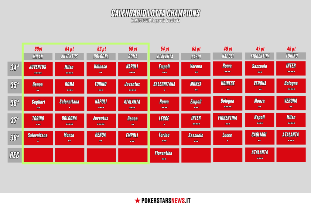 Attualmente i punti di vantaggio sul quinto posto sarebbero 15, ma sia Roma che Atalanta hanno una partita in meno rispetto ai rossoneri. Sembra impossibile scendere al di sotto della sesta posizione, ma una sconfitta contro la Juventus potrebbe dare il là ad una pericolosa spirale discendente. La partita in casa contro una Salernitana presumibilmente già retrocessa all’ultima giornata però garantisce un’alta probabilità di ottenere anche nella peggiore delle ipotesi i punti necessari per la Champions.