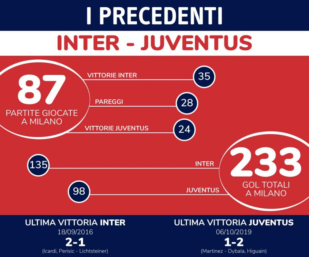 Dal 2011 i padroni di casa sono però riusciti ad imporsi soltanto una volta, ovvero nel settembre del 2016 con un 2-1 targato Icardi e Perisic. La scorsa stagione, invece, fu la Juve ad avere la meglio col risultato di 1-2: di Lautaro, Dybala ed Higuain le firme.