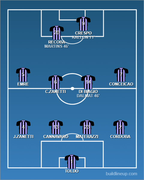 Risponde Héctor Cuper con Toldo tra i pali. Difesa a quattro composta da Cordoba, Cannavaro, Materazzi e Zanetti, il capitano. Centrocampo: Emre, Cristiano Zanetti, Conceiçao e soldatino Di Biagio. In attacco, Hernan Crespo e Alvaro Recoba.