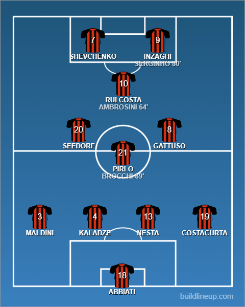 Mister Carlo Ancelotti (al suo primo anno completo in rossonero) schiera in campo un undici solido difensivamente e imprevedibile offensivamente. Tra i pali Abbiati. Difesa a quattro composta da Maldini e Kaladze sugli esterni con Nesta e Costacurta a schermare l’estremo difensore rossonero. A centrocampo Gattuso col compito di interdire, Pirlo con quello di impostare e Seedorf con entrambe le mansioni, praticamente. Trequartista Rui Costa, due punte: Inzaghi e Shevchenko.