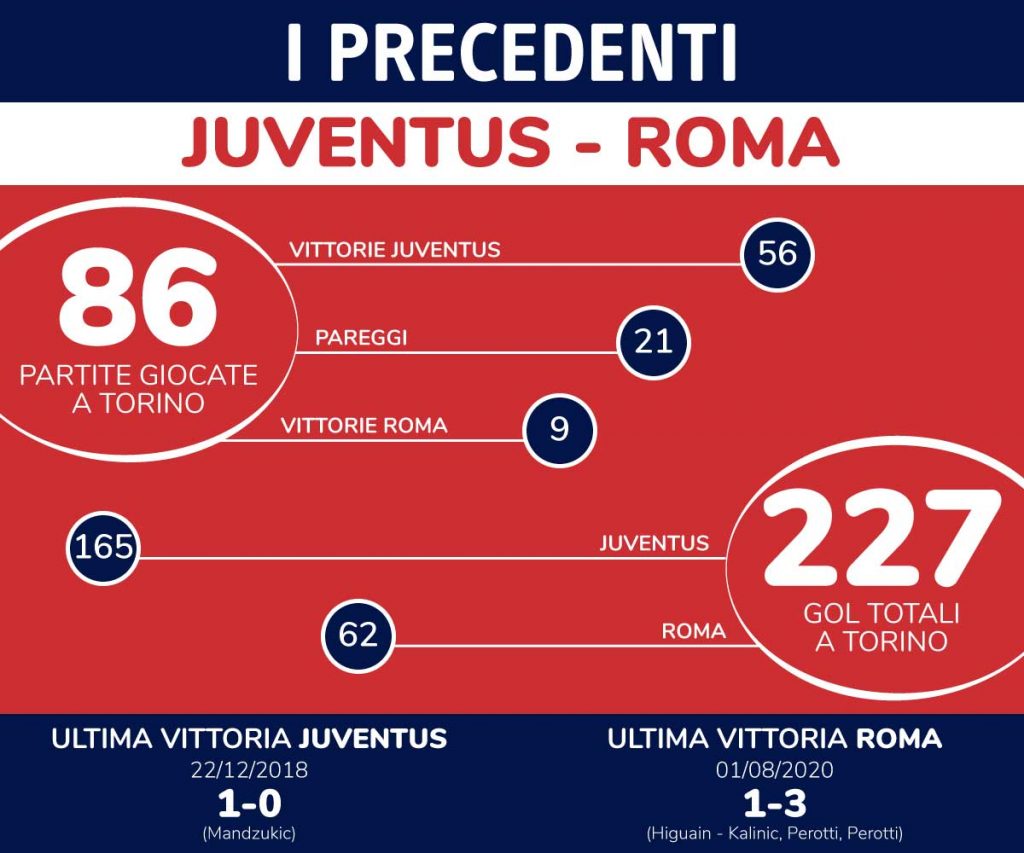 Confronto dalla storia ricca di aneddoti e polemiche, la sfida tra Juventus e Roma si è giocata 86 volte a Torino, con i padroni di casa che hanno vinto in 56 occasioni, lasciando agli ospiti solo 21 pareggi e 9 vittorie. L’ultima di queste vittorie è arrivata il 1° agosto 2020, all’ultima giornata di un campionato già vinto dai bianconeri che scesero in campo con molte riserve e giovani. Al vantaggio juventino di Gonzalo Higuain risposero i gol di Nikola Kalinic e la doppietta di Diego Perotti.