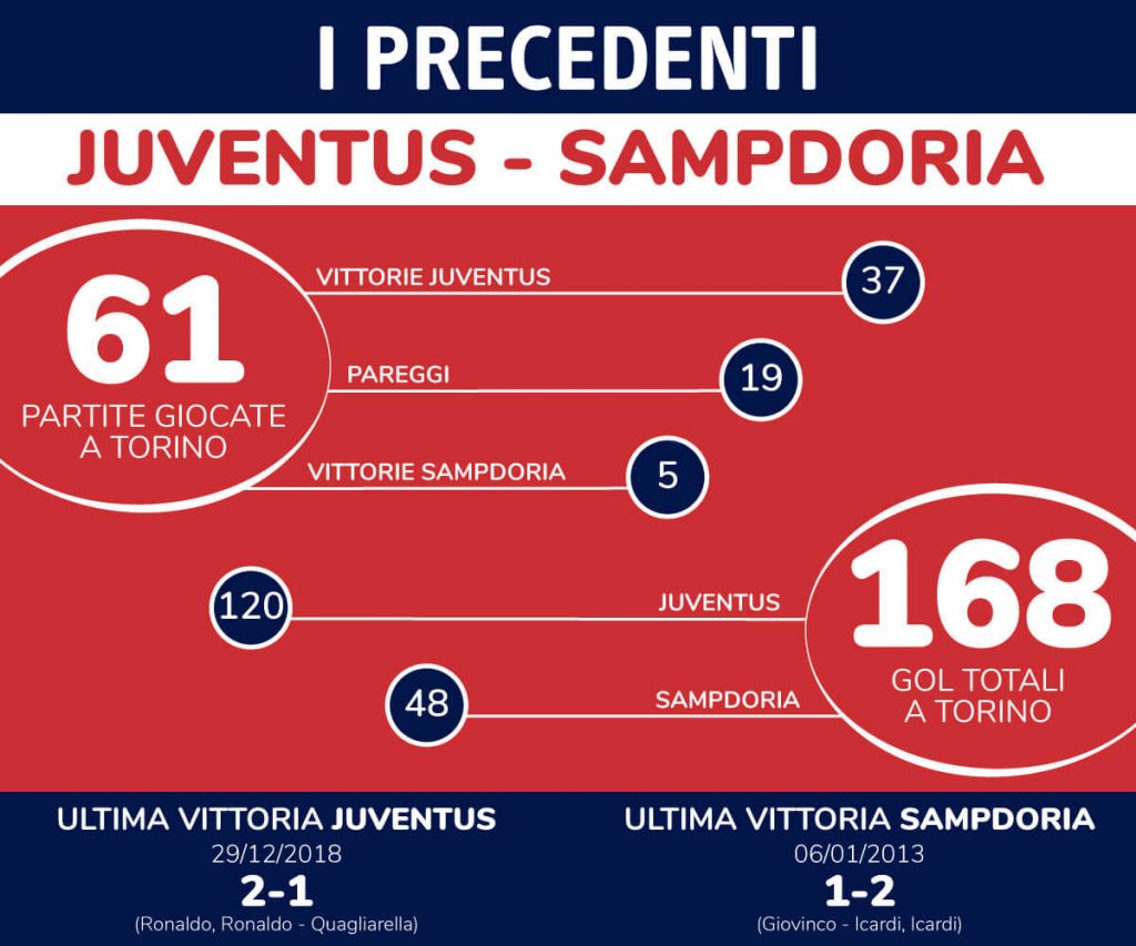 Sono molti i precedenti che vedono contrapposti bianconeri e blucerchiati in Serie A, a Torino. Juve e Samp, infatti, si sono incrociate ben 61 volte nel capoluogo piemontese. Nel confronto, vi è una netta supremazia bianconera, con 37 vittorie complessive, a fronte di 19 pareggi e sole 5 affermazioni liguri.