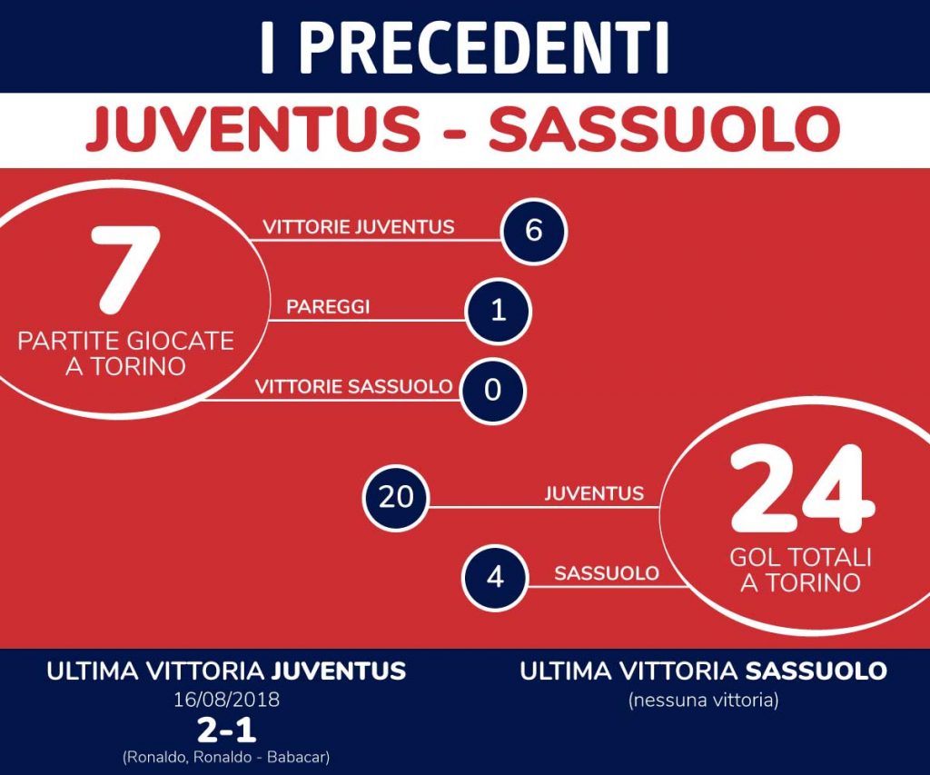 Statistica davvero impietosa quella che riguarda i precedenti del Sassuolo a Torino: la squadra emiliano è infatti uscita sconfitta dallo Stadium tutte le volte che si è presentata, ad eccezione della scorsa stagione in cui si registrò un pari, subendo un totale di 20 gol e segnandone solamente 4. Computo totale, quindi, di 7 partite con 6 vittorie Juve ed un solo pari.