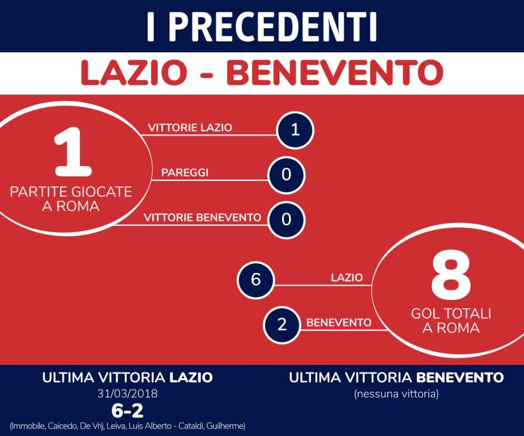 Il Benevento è approdato in Serie A per la prima volta nella sua storia nel 2017, per poi retrocedere nuovamente l’anno successivo: questo fa sì alla voce “precedenti” con la Lazio il valore non possa che essere uno.