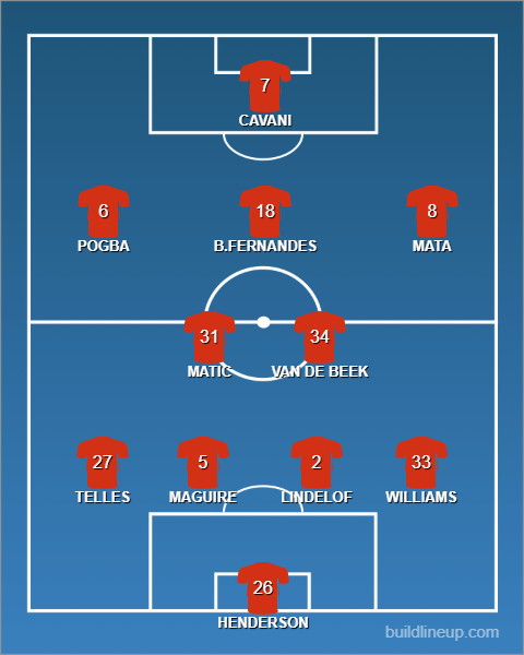 Probabile formazione Manchester United: (4-2-3-1), Henderson; Wiliams, Lindlof, Maguire, Telles; Matic, Van De Beek; Mata, Bruno Fernandes, Pogba; Cavani. All. Solskjær.