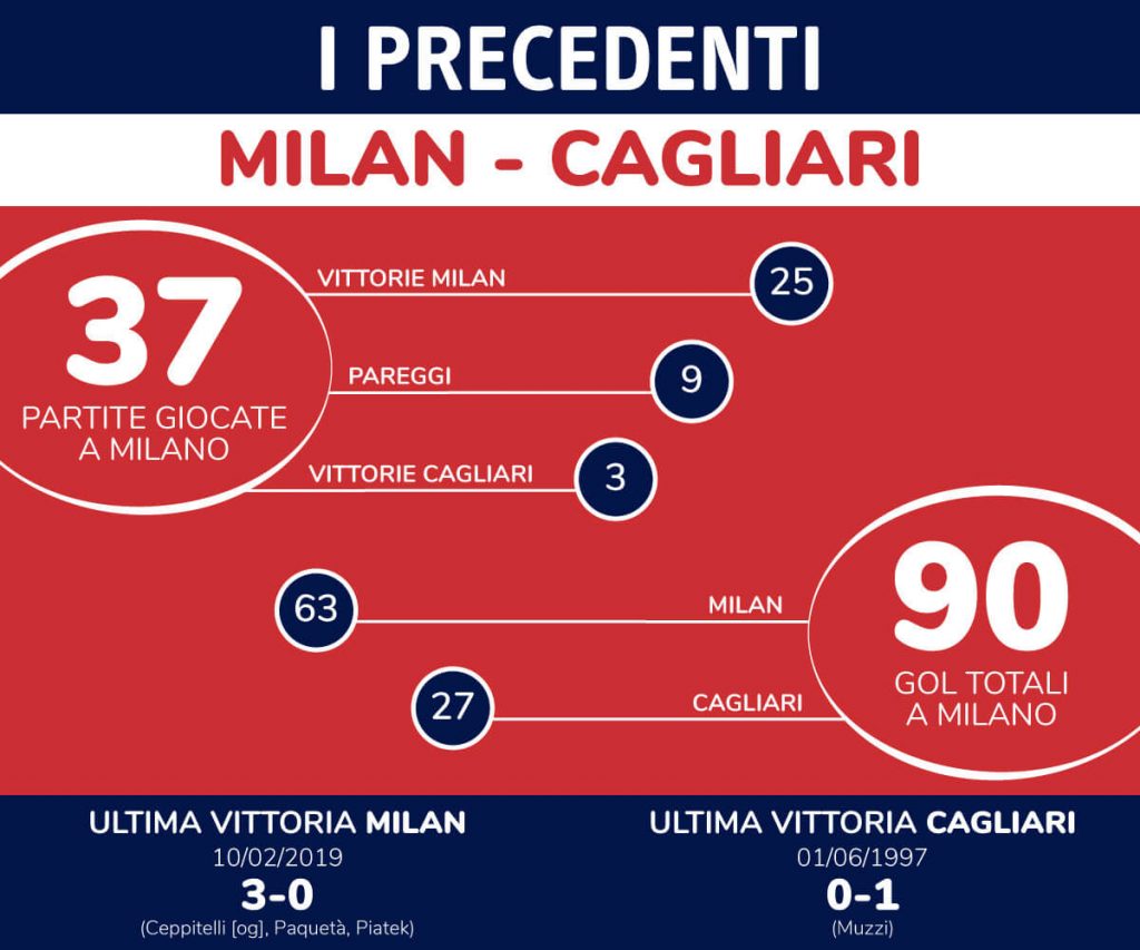 In 37 partite giocate a San Siro, il Cagliari è stato sconfitto dal Milan in 25 occasioni, mentre è riuscito ad espugnare lo stadio milanese solo in 3 occasioni. Ma sono ben 20 anni che gli isolani non riescono a tornare a Cagliari imbattuti: dal pareggio per 2-2 del 17 ottobre 1999, firmato da Domenico Morfeo e Daniele Berretta per i rossoblù e da Andriy Shevchenko e Oliver Bierhoff per i rossoneri, il Milan ha inanellato una serie di 14 vittorie consecutive.