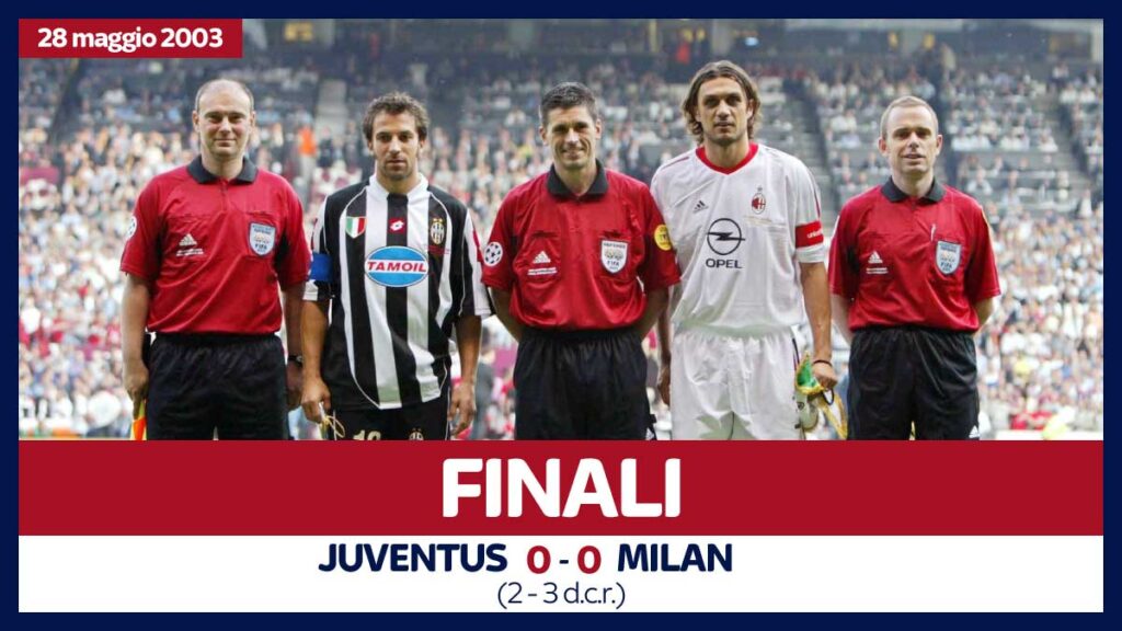 28 Maggio 2003. Una data scolpita per sempre nei cuori dei tifosi del Milan e in qualche modo anche in quelli di fede juventina. E’ la notte in cui si consuma la prima finale di Champions League fra due squadre italiane. L’Old Trafford di Manchester come cornice per l’ultimo atto di una sfida che si risolverà soltanto dagli 11 metri. Milan – Juventus è la finale di Coppa dei Campioni: da una parte il gioco spumeggiante e certe volte fin troppo ricercato della truppa di Ancelotti, mentre dall’altra parte il pragmatismo e il cinismo bianconero.