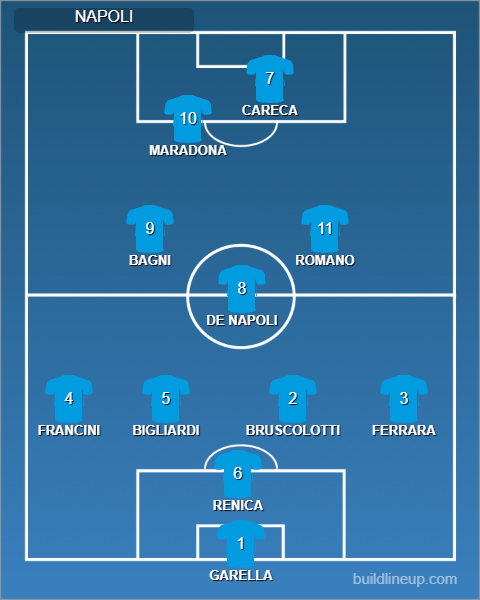 Il Napoli è attaccato al Milan e il suo condottiero, Diego Armando Maradona, è il miglior marcatore della Serie A – chiuderà con 15 reti, tanto per dare la misura di che razza di calcio fosse. Il Napoli ha un attacco stellare ma una difesa più ballerina.