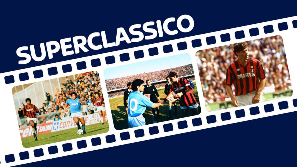 La sfida tra Napoli e Milan è soprattutto quella tra Maradona e Van Basten, tra Careca e Gullit, tra Ferlaino e Berlusconi, tra il Sud che sfiora il dio del calcio con un dito e il Nord che, tronfio d’ateismo pragmatico, riporta il miracolo nella sua dimensione terrena. Dopo la vittoria del Napoli nella stagione 85/86 (reti di Maradona e Giordano, con gol della bandiera di Di Bartolomei per i rossoneri), il Napoli perderà sia l’andata (4-1) che il ritorno (2-3) contro il Milan nella stagione 87/88, quella del primo Scudetto – con Sacchi allenatore – del neonato impero berlusconiano. Si deve attendere la stagione 89/90 per un doppio scontro da Scudetto tra Napoli e Milan, 3-0 all’andata per i partenopei, 3-0 al ritorno per i rossoneri, ma Scudetto a Maradona e popolo napoletano. In mezzo, stagione 88/89, la vendetta del Napoli (4-1) nell’anno del tricolore del Biscione.