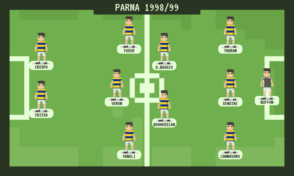 Dalla citola in su però, il Parma non solo non era da meno, ma poteva anzi contare sulla batteria di attaccanti più preziosa della Serie A (e non solo). Fulcro del gioco offensivo Malesani poteva contare su un Sebastian Veron capace di gestire al meglio il pallone e con una visione perfetta per servire attaccanti che riuscivano a trasformare in oro i suoi tocchi.