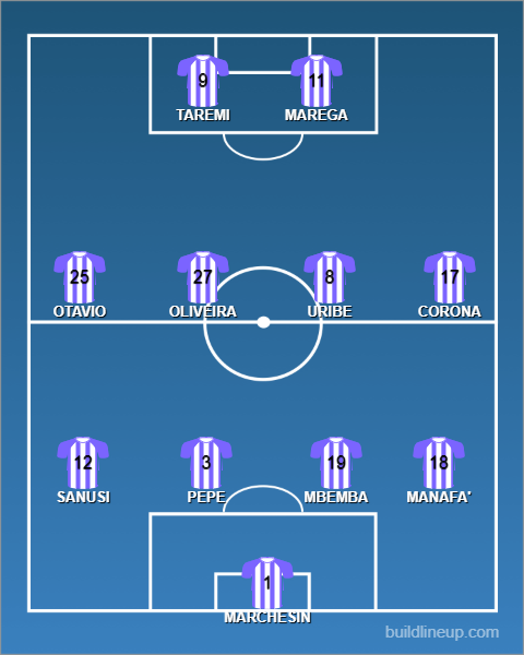 Tutti e tre i bomber della squadra saranno in campo dall’inizio nella sfida di sabato, con il centrocampo completato da Jesus Corona, Otavio e Mateus Uribe. In difesa Pepe e Chancel Mbemba, con Zaidu Sanusi e Wilson Manafà terzini e Agustin Marchesin in porta.